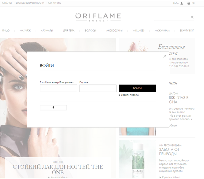 1. Вам нужно зайти на сайт компании, для этого нажмите кнопку "ВОЙТИ" в правом верхнем углу и в выплывшем окне введи свой номер консультанта и пароль (если вы его не получила или потеряла напишите мне или своему спонсору, мы поможем восстановить) Россия www.oriflame.ru Белоруссия www.oriflame.by Казахстан www.oriflame.kz Украина www.oriflame.ua